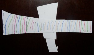When she was finished she asked for an index card. I had no idea what to expect but thought that perhaps she was going to cut out her drawing and paste it onto the card. I was surprised when she finished because she showed me an airplane that she had made by herself – cutting it out from the card and pasting all by herself. The amazing thing for me is because this was completely self-directed work. I did not suggest to make something in particular – she took it upon herself to decide what she wanted to make and did it all by herself.
