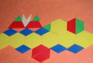 Today we decided to include her in our Math lesson plan. We are currently using Saxon Math for Kindergarten and at least at this point – we are learning basic skills that would not be too much for a preschooler (I don’t know about the rest of the book though). Anyway, today we were introduced to making patterns with pattern blocks. I cannot tell you how surprised I am about how much my youngest enjoyed this activity. We not only made patterns ourselves, but we also worked on a pattern sheet that already had a pattern and you had to place the shapes in the correct place (what I can’t believe is that my youngest always finished before her older sister! She seems to have a knack with puzzles.)