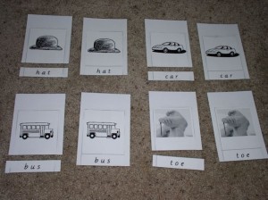 To make the cards, I simply did a search on Yahoo and Google to see what pictures I could find (I searched under images). Thus, if I was looking for a picture of a house, I would search under images for “house.” I decided to make all of these pictures black and white so I clicked on black and white images to find what I wanted. After finding them, I copied the image and pasted it into Powerpoint onto the card size I wanted (drew boxes) and put the name of the item below. If this is too much for you, simply cut and paste the picture into a document and make a different document for the word label. Then I would print off two copies of each page on normal paper – cut them out and tape them to a large index card. I made sure to put the label exactly at the bottom of the card to ensure the labels were all starting at the same point (thus, the same size). Then, on one copy of each card I would cut off the labels.