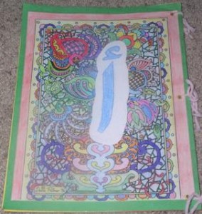 Here’s a nice project we have been working on – I like it so much we are going to continue (Insha’Allah). We are making alphabet books. Essentially we do some nice artwork project first (my kids do these routinely because they like coloring so much). I must admit – you found out – I actually colored this one! Anyway, I glue the art page to a page of construction paper then I cut out the template for the letter we are working on (check the Yemenlinks site for sandpaper letter template) and glue it on top of the art page. After this is done, I laminate this front page of the book and another construction paper for the back of the book. I use construction paper for the entire book and glue pictures that start with that letter. Here’s what I do: First, I go through the dictionaries I have (since my knowledge of Arabic is still quite limited) and find any words that begin with that letter – words that I can easily find pictures for.