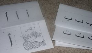 I used the large arabic letters for my 3 – 4 yr old students and let them texture each letter with different items e.g sea shells, coloured sand, tiny pebbles, bark of the tree etc. each student makes their own book and they love it.