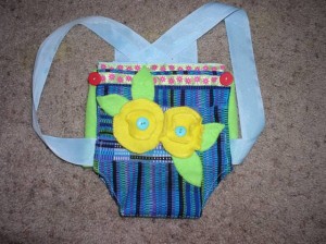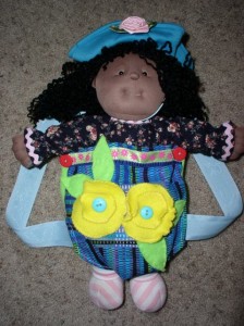 I felt guilty about sewing things for the oldest two and leaving out the youngest – so I broke down and quickly made a backpack to carry her “babies” in. I found on some blog out there a cute picture of a backpack for carrying dolls. I thought it was cute – so I thought I’d try my hand at it. Here’s a picture of the final product. She absolutely loves it and wants to wear it everywhere, masha’Allah.